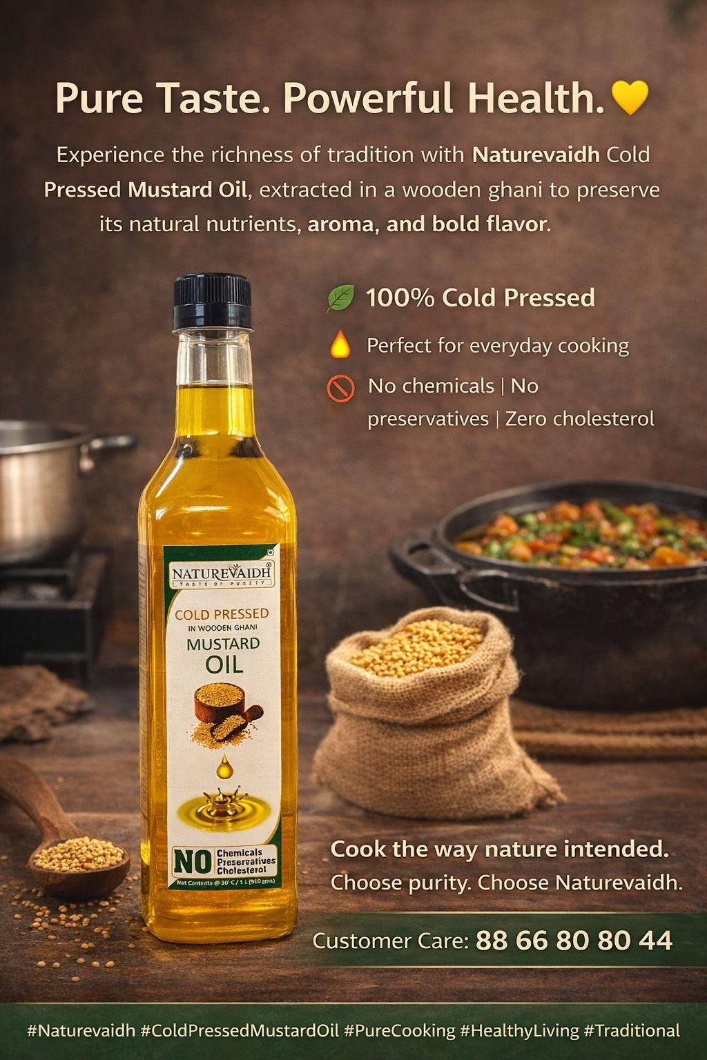 Naturevaidh’s cold-pressed mustard oil preserves the essential nutrients inherent in mustard seeds. Free from additives and chemicals, this oil showcases a high smoking point that makes it ideal for frying and sautéing, all while ensuring every dish is as wholesome as it is delicious. Packed with monounsaturated fats and antioxidants, it contributes to improved heart health and overall wellness.